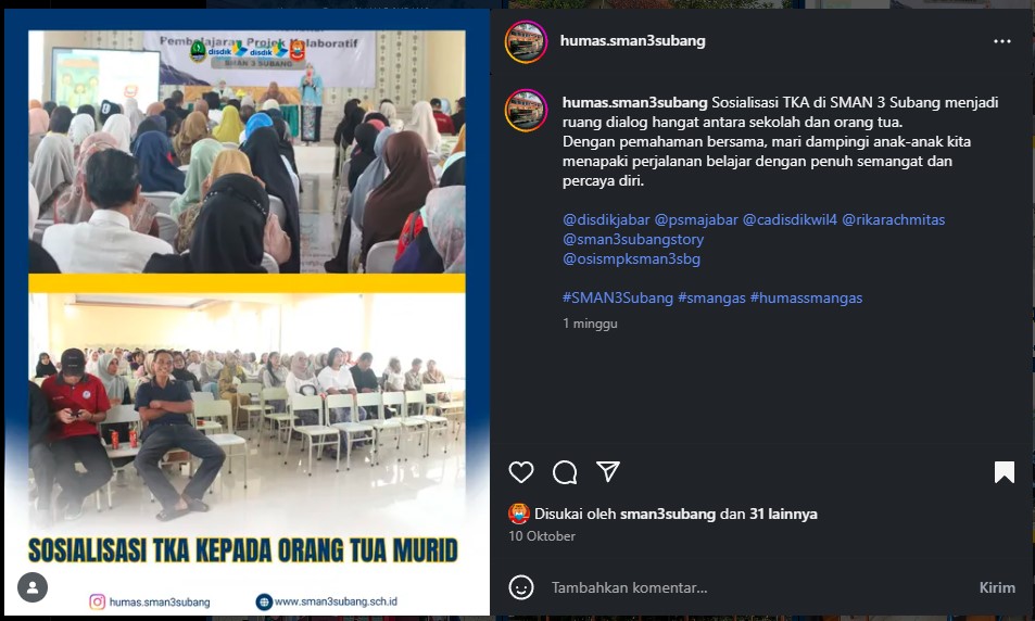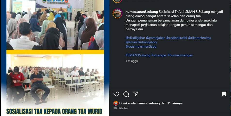 Dalam rangka memberikan pemahaman yang lebih komprehensif kepada orang tua mengenai pelaksanaan Tes Kemampuan Akademik (TKA) sebagai salah satu bentuk asesmen sumatif bagi peserta didik kelas XII, SMAN 3 Subang menyelenggarakan kegiatan Sosialisasi TKA pada Jumat, 10 Oktober 2025 bertempat di Aula SMAN 3 Subang.